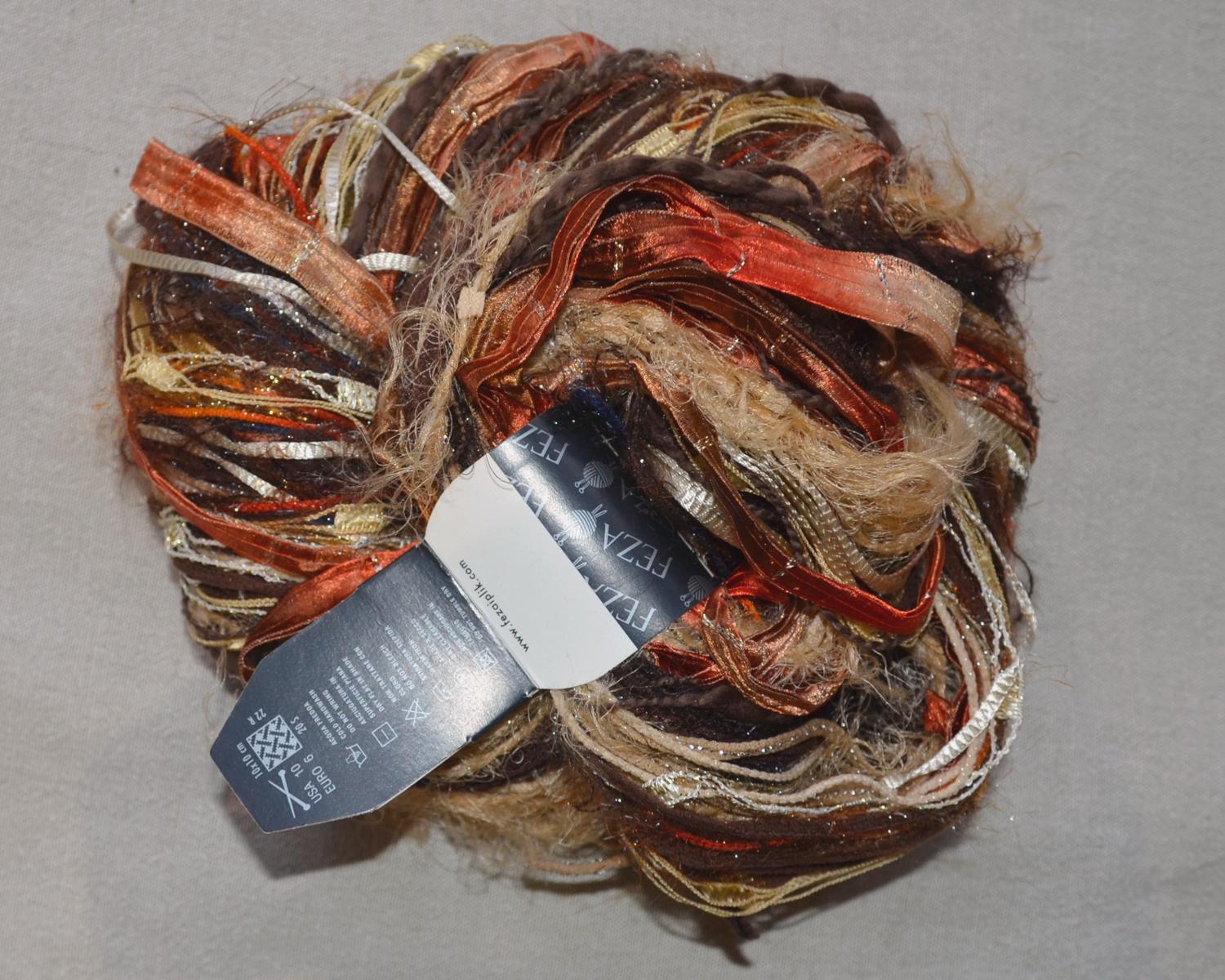 1 Echeveau magic ball ocre ; un écheveau composé de différentes matières assemblées à la main