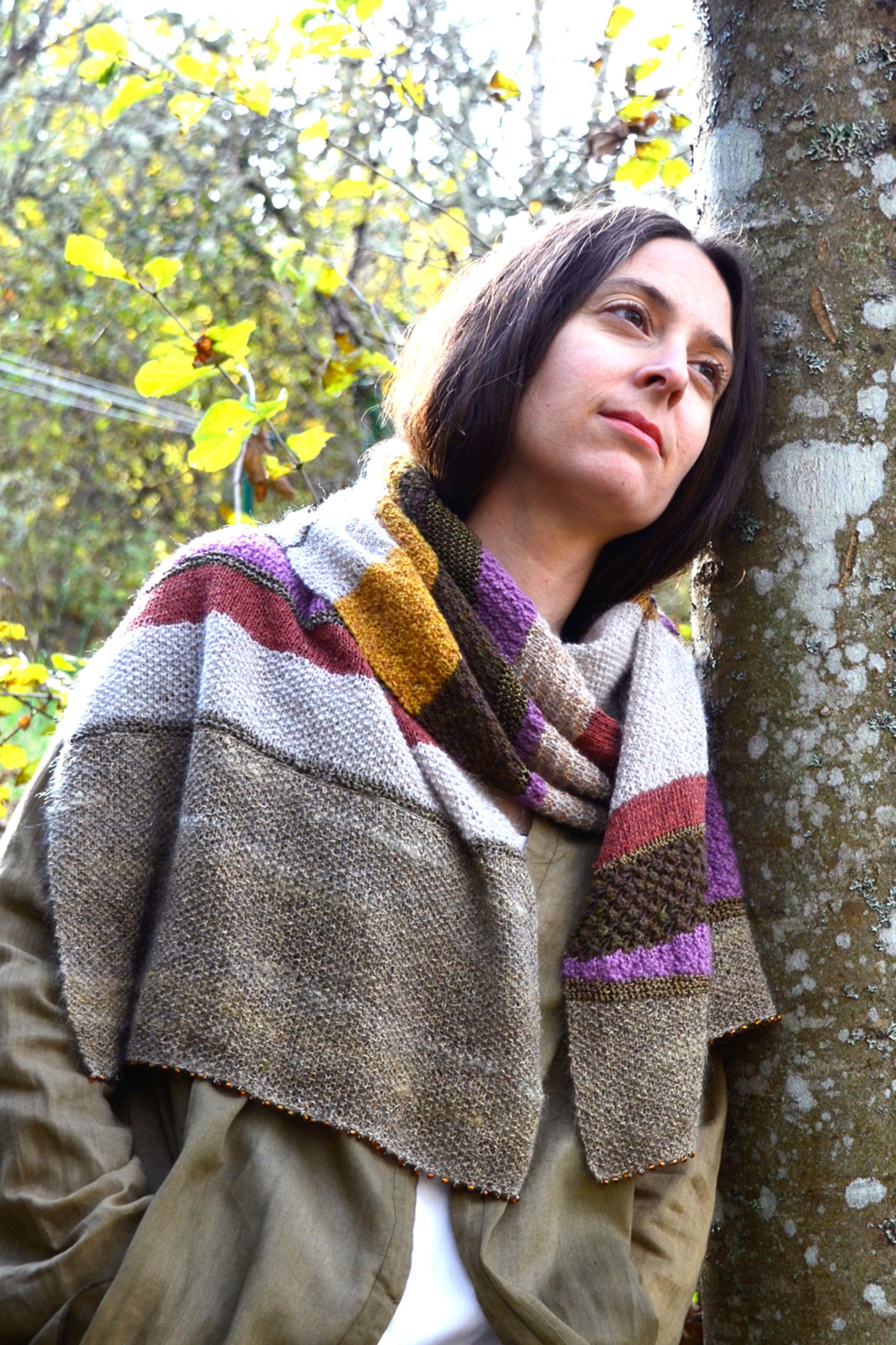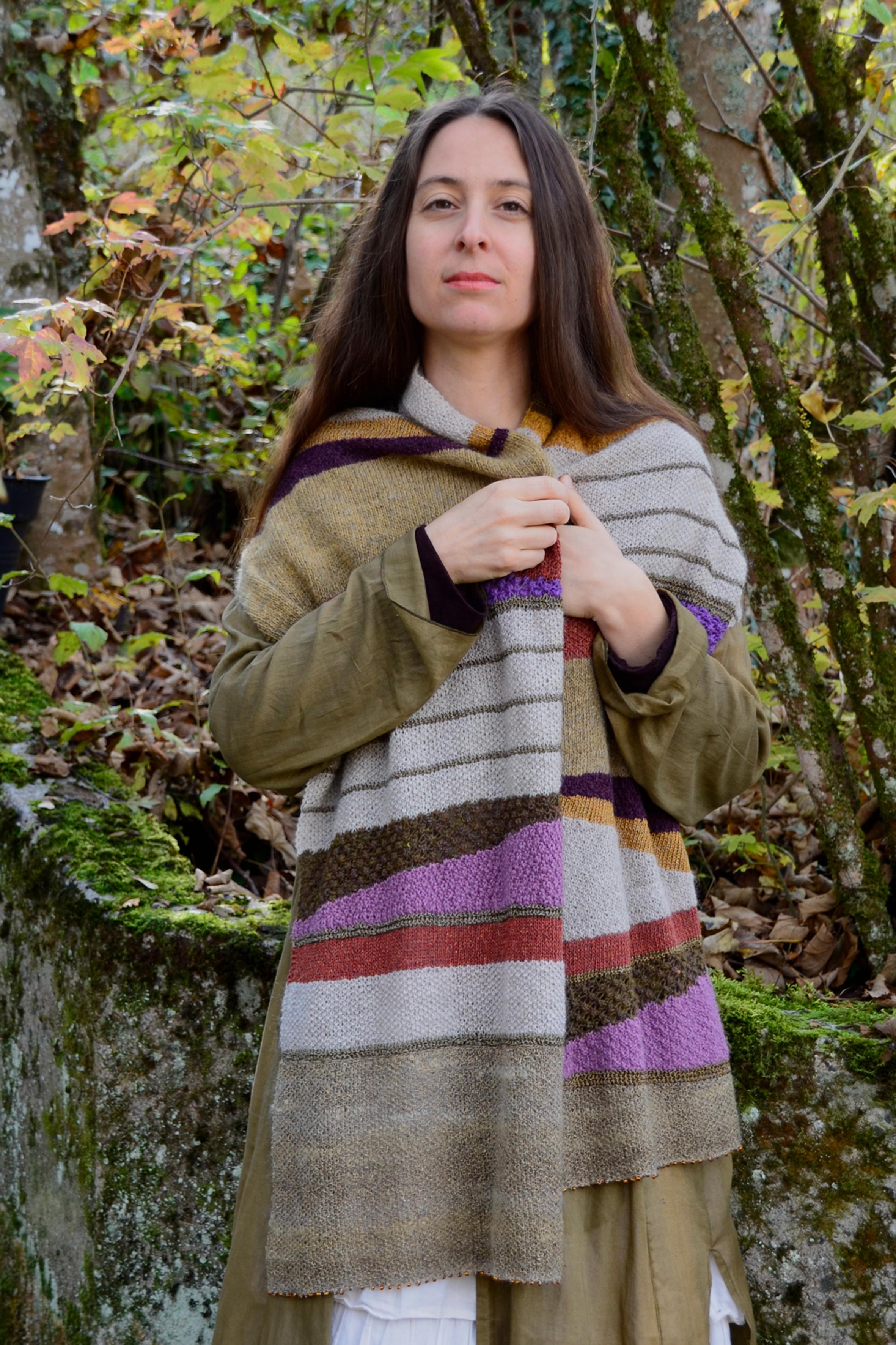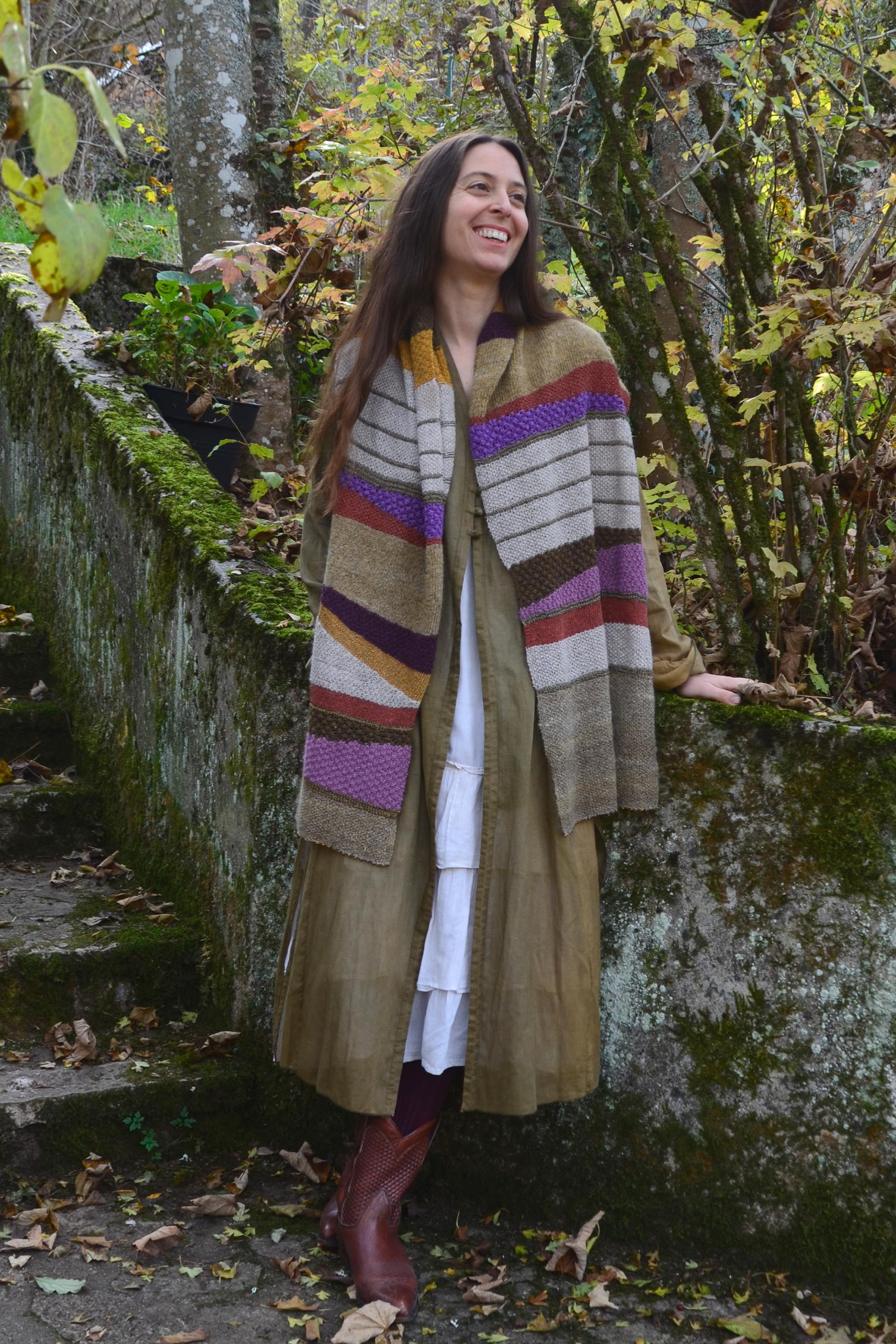 L'étole Rois Mages est réalisée à la main avec différents fils de laine, soie, mohair et fil doré.