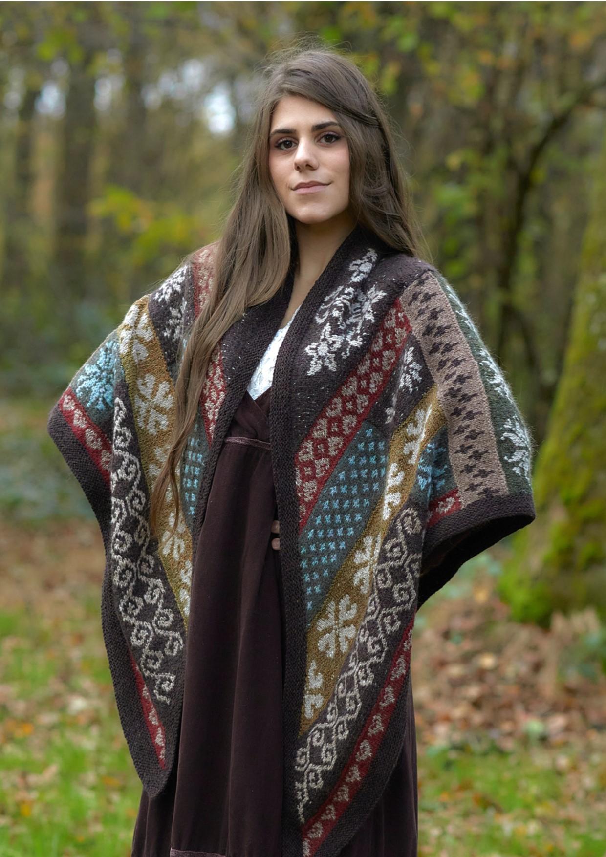 Il est réalisé avec un fil Aztec (48% alpaga, 20% lin, 32% nylon) et Fuuga (65% extra kid mohair, 5% laine, 30% nylon)tricotés ensemble, les fleurs sont réalisées en Flower Bed (35% soie, 35% mohair, 30% laine) avec un fil de paillettes au centre.