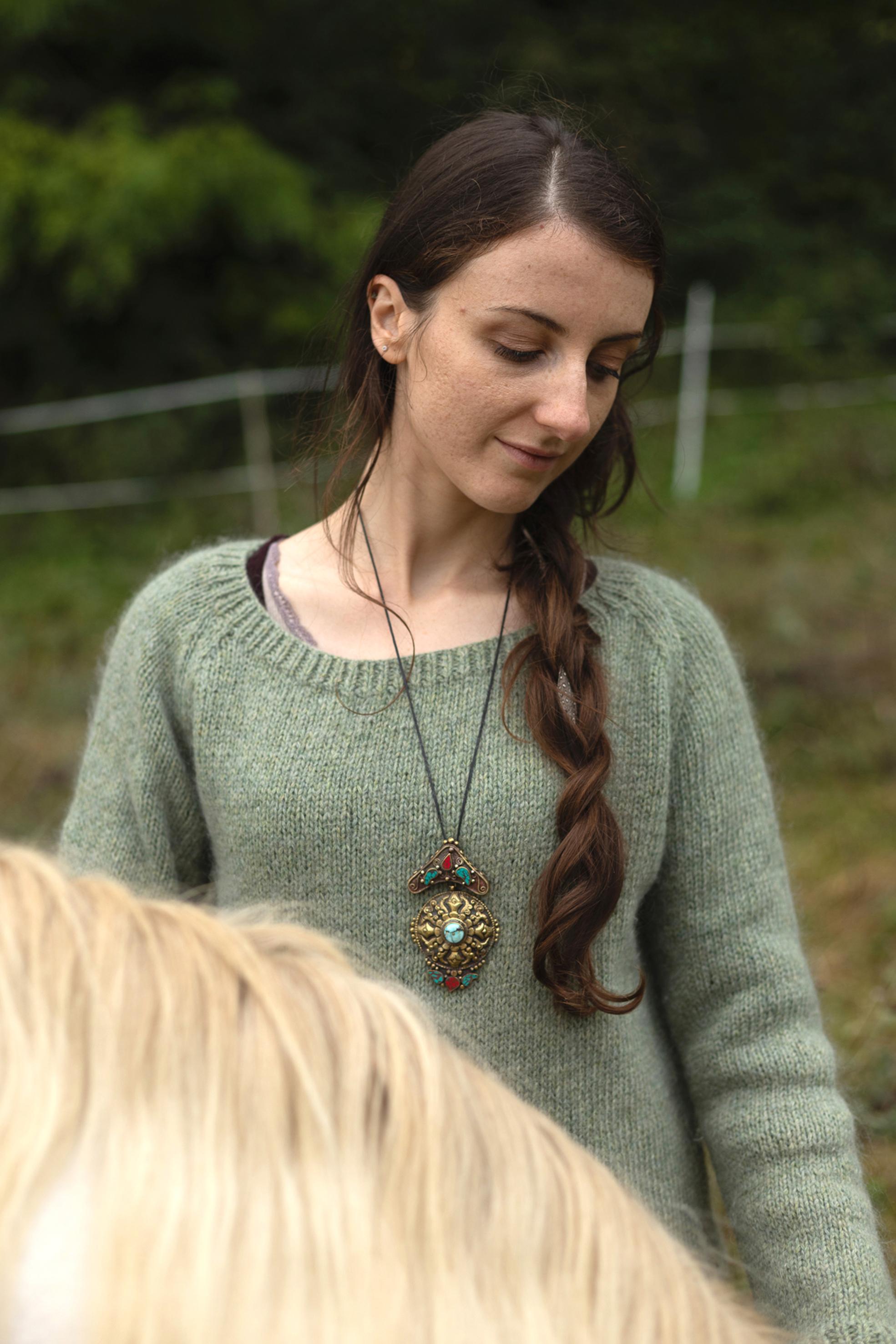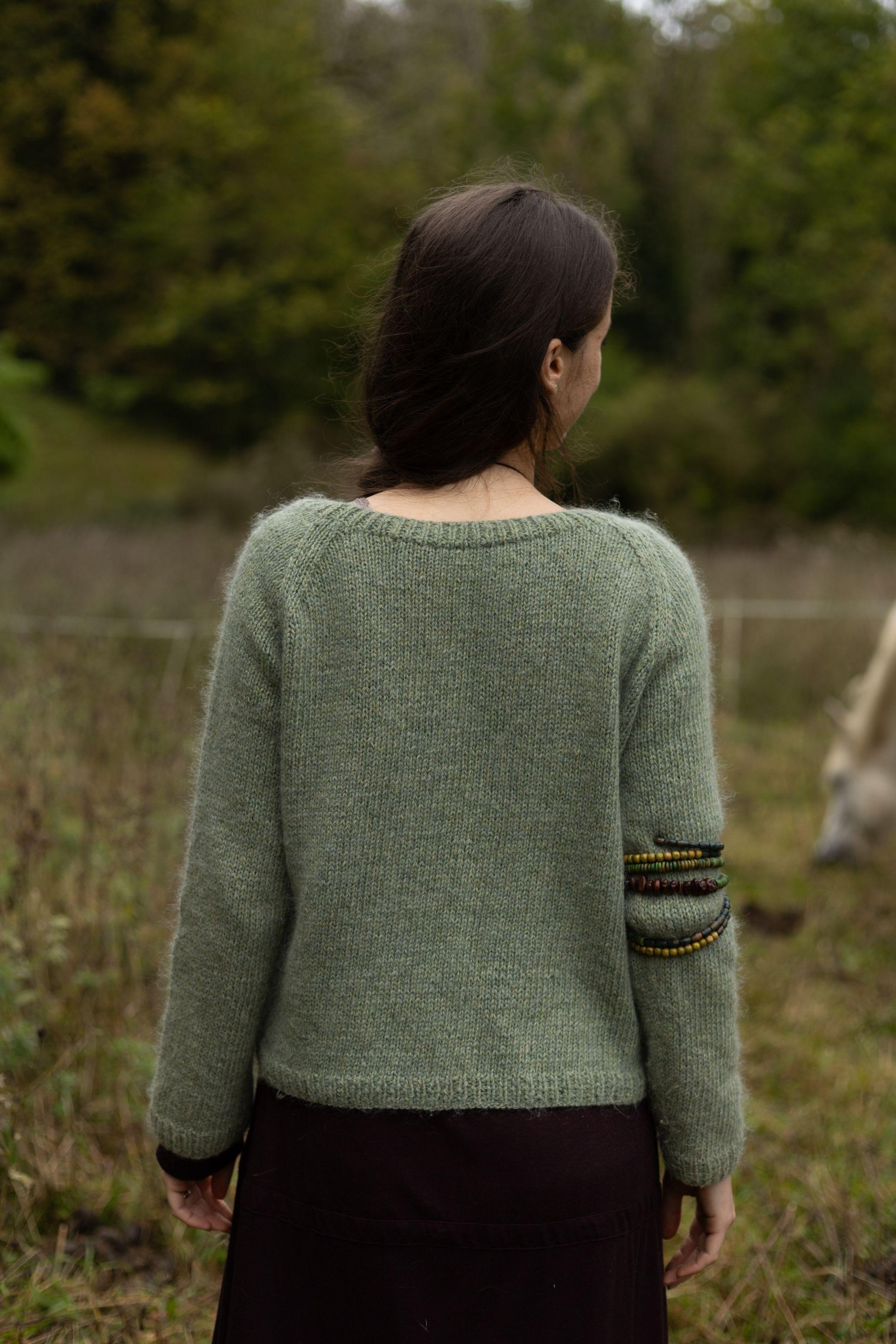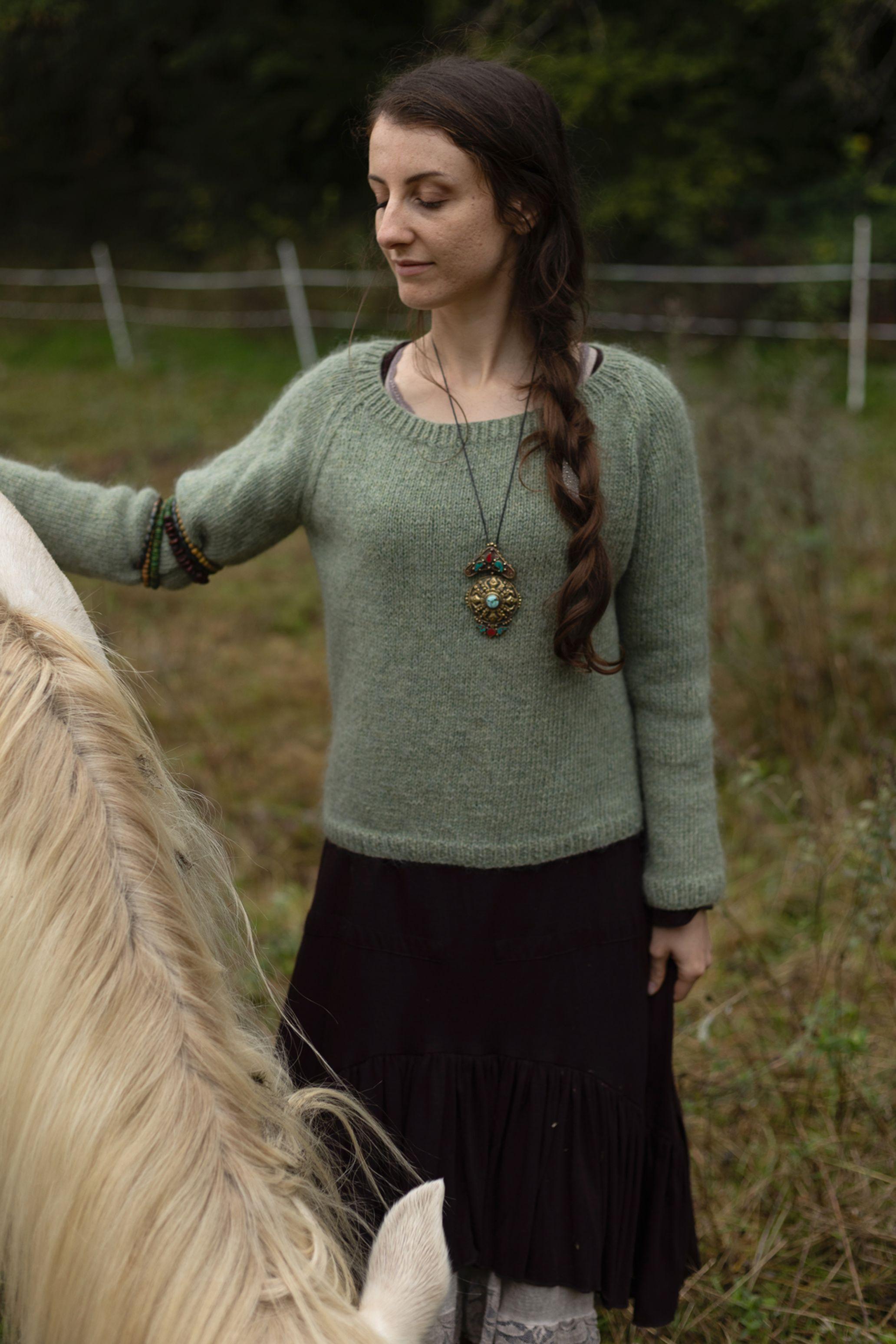 Les détails comme les manches raglan, l'encolure bien dégagée, la douceur de la laine et du coloris lui apportent beaucoup de féminité.